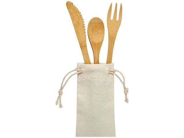 Набор столовых приборов Celuk из бамбука. Набор столовых приборов из бамбука состоит из вилки, ножа и ложки. Поставляется в нетканом мешочке. Бамбук.
