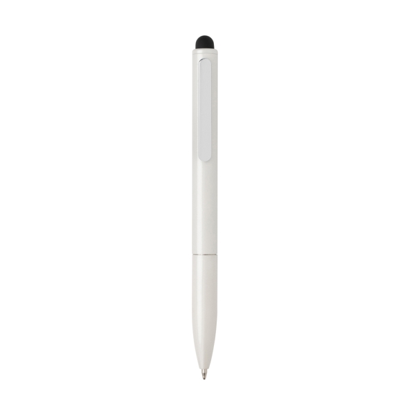Ручка Kymi сочетает в себе классическую шариковую ручку и стилус для сенсорных экранов. Изготовленная из переработанного алюминия, она получилась легкой, прочной и приятной на ощупь. Такая ручка станет отличным подарком тем, кто заботится о природе: алюминий — уникальный материал, который можно перерабатывать бесконечно. Она удобно сидит в руке и обеспечивает плавное письмо. Стержня с синими немецкими чернилами Documental хватит на 700 метров письма. Сертифицировано RCS. Эта сертификация полностью контролирует путь поставок переработанных материалов и гарантирует их наличие в изделии.